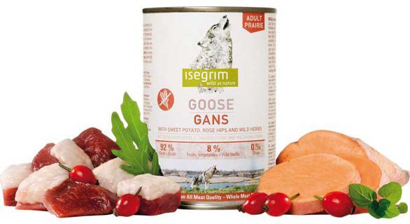 Мясо и мясные субпродукты (32% мясо гуся, 30% мяса птицы), бульон (28,8%), овощи (4% сладкий картофель), фрукты (4% шиповник), минералы (1%), травы (0,1%), масла и жиры (0,1% лосося).